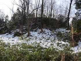 | 北東側の城塁。堀は埋められてしまっており、城塁の高さはかなり低くなってしまっている。 | 城内から北西側の土塁を見たところ。上端幅がけっこうある。また、側面部に石積みがあるが、これは後世のものであろうか。 |