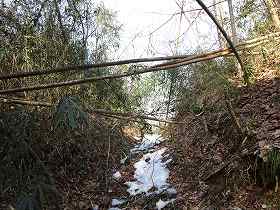 | 1郭南側下城塁は往時のままの崖面となっていて、とても登れない。 | 1郭下西側の堀切。この先に箱堀状の遺構がある。 |