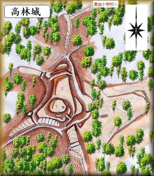 黒岩小学校の北側600mほどの所にそびえる比高80ほどのピーク部周辺が高林城の跡である。