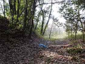 | 登城道をずっと進んでいくと、城塁下を回り込んで南側の堀切の所に出る。ここから1郭への導入路がある。 | 1郭への通路。竪堀状の通路を登って行くようになっている。両側の上にはテラス状の小郭がある。 |