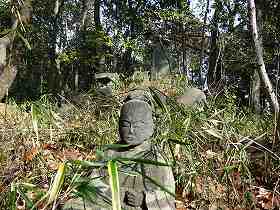 | 御岳社のある土塁の背後。やや窪んでいるようにもみえ、堀切が存在していた可能性がある。 | 土塁上の御岳社。優しそうなお地蔵さんが鎮座している。 |