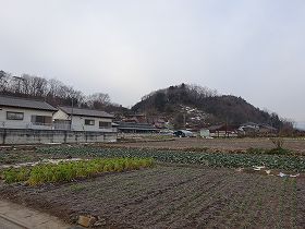 | 南側から遠望した富岡城。比高30mほどの山稜である。 | 西側の尾根続きの部分は切り通しの道路となって削り取られている。 |