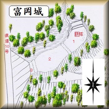 県道10号線のバイパスが大きく山稜を切り通している部分の東側の比高40mほどの台地先端部が富岡城の跡である。鉄塔が立っているのですぐに場所は分かる。