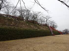 公園となっているため、駐車場やトイレもしっかりしている。遊具もあり、大人も子供も散策して楽しめる公園である。この日も、雨がちの天気であるにもかかわらず、何人もの人が訪れていた。高さ8mの切岸側面部にはローラー滑り台まである。これは私も大好きなものである。雨が降っていなかったら滑っていたことであろう。