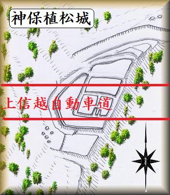 大沢川の西側にそびえる比高60mほどの台地先端に降った辺りに神保植松城は築かれていたが、現在は上信越自動車道によって真っ二つに分断されている。主郭のあった部分が、そっくりそのまま消滅してしまっている。