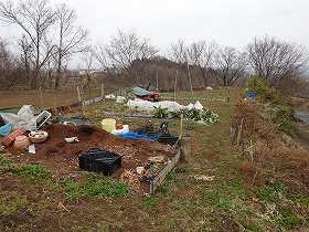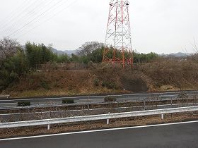 | 高速道路の北側から削られた土手を見たところ。主郭部は完全に消滅してしまっている。 | 高速の北側に残る郭の跡。 |