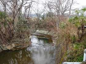 | 1郭先端部から見た天引川。 | 1郭北側の城塁。鋭い崖となっている。 |