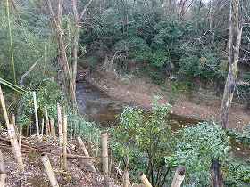 | 北側の虎口と門。両脇には堀と土塁が残る。 | その堀だが、このような状況で、写真ではよく分からない。 |