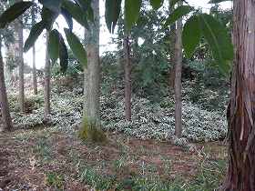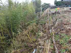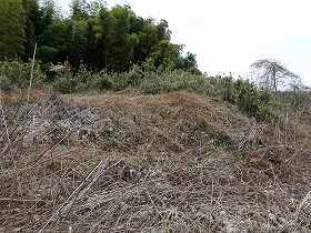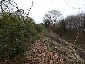 台地先端部近くは荒れ地になってしまっているので、遺構があるのかどうかよく分からない。一部に下の写真のような土手が見られるのであるが、これがそのまま遺構を示しているのかどうかは不明である。