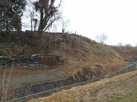 | 天引川に臨む土手は削られており、天然の切岸となっている。 | 1郭東側に残る土塁は石積みで加工されている。 |