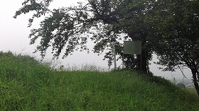 周辺に車を停める場所がないので(水道施設の前には駐車場があるので、そこに停めて「立ち入り禁止」の柵の脇を抜けていくという手段もある)、下の池の脇辺りの路肩に車を置いて、先の物見台を目指した。ところが、この日は雨で、ここまでたどり着くのも大変であった。というのも、そこまで行く途中の道には草が膝の高さまで繁茂しており、案内板のところまで行くのに、ズボンとスニーカーがぐしょぬれになってしまったのである。それ以外も、遺構のありそうなところはヤブだらけである。