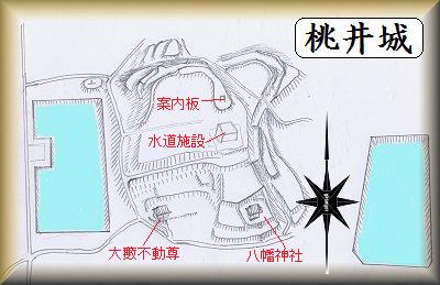 桃井城は、東西にある2つの池に囲まれた比高20mほどの微高地に築かれていた。城址南側には大藪不動尊(金剛寺)と八幡神社とがある。