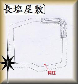 長塩屋敷とは珍しい名称であるが、ここの主人は塩に関連した事業を行っていたのであろうか。それは不明だが、屋敷跡の民家の入り口に、標柱が立てられている。