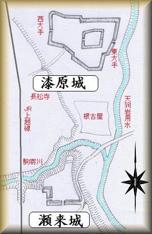 漆原城は、長松寺の北東200mほどのところにあった。また、瀬来城は、その南側600m、北側に突き出した比高20mの台地先端部に築かれていた。