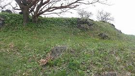 | 郭内部。岩がいくつかゴロゴロしている。 | 南側側面部の帯曲輪と1郭城塁。 |