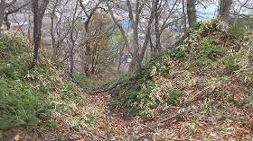 | 上の土塁の残欠から下を覗き込むと、そこには見事な竪堀があった。 | 二重堀に架かる橋。地形が傾斜していて、堀も流れるように東側に緩やかに落ちていく。 |