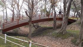 それを進むと通路の右手に土塁の痕跡が残されている。そして東側には二重の堀が長く延びているのが見え、下の方に赤い橋が架かっているのも見えてくる。