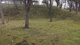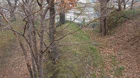 | 北側の公園入口から進んでいくと、写真の土塁状のものが見えてくる。これも遺構なのだろうか。 | 遺構の二重堀のうち、西側の一部は、公園の道理を造った際に埋められてしまったようだ。しかし、よく見れば、台地縁部には土塁の残欠が見られる。 |