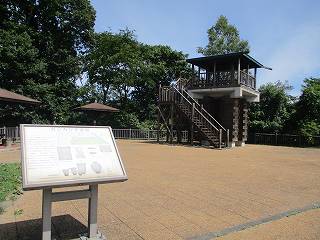 実際の遺跡は台地の北側先端部分で、ここにも案内板が建てられ、展望台も設置されている。ただし、一面は舗装されているので、遺跡面は見られなくなってしまっている。