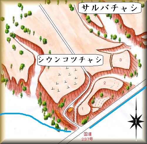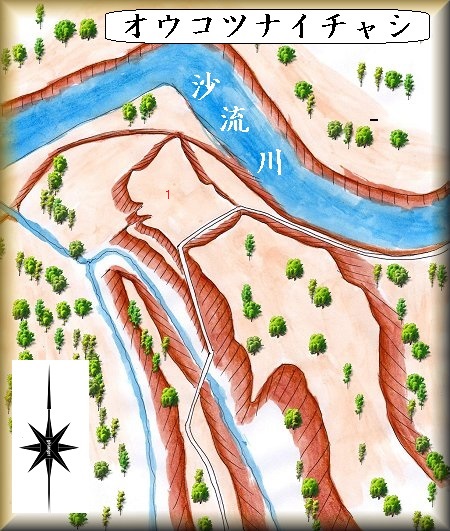 カーブする地点には1と2の2か所に三角形状の張り出し部分が見られるのだが、北の遺跡の示している地点はちょうと1と2の中間点辺りなので、1と2のどちらがチャシ跡なのかよく分からない。
