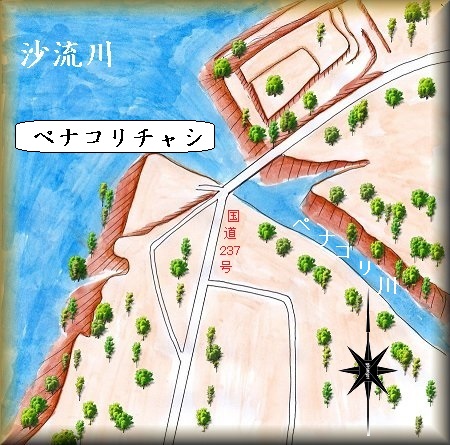 ペナコリチャシは、ペナコリ川に架かる橋の西側の台地縁部に築かれていた。