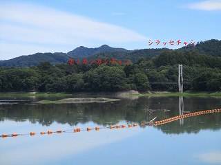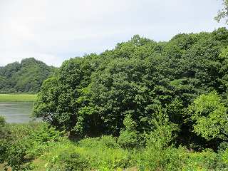 | 二風湖。ポロモイチャシは、右側の端辺りにあったようだが、ダム建造の際に削られて消滅してしまった。 | ダムの堰堤からチャシ西側の城塁を遠望したところ。 |