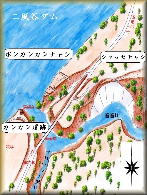 看看川を挟んでポンカンカンチャシの南側に向かい合う位置にあるのがカンカン遺跡である。この遺跡については、二風谷ダムにあった案内板にも記載されており、国道沿いに案内板も設置されている。