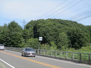 看看橋を渡って行くと、西側に山林化した山稜が見えているが、これがポンカンカンチャシの跡である。その先を進んで行くと、西側の谷戸部に入って行く道路がある。その道路は通行止めになっているのだが、入口の部分にはスペースがあるので、ここに車を停めて置くことができる。