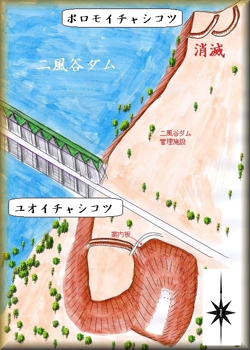 ポロモイチャシは二風谷ダム管理施設のすぐ北側の台地縁にあった。こちらは堀に囲まれた2郭構造の城館であったようだが、上記の通り、ダム工事の際に削り取られてしまい、こちらは消滅してしまっている。鳥瞰図は案内板の図に基づいたものである。