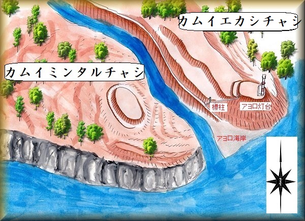 カムイミンタルチャシは、断崖の上であり、笹薮が茂っているので、内部に入っていくことはできなかったのだが、『城郭体系』には「航空写真を見ると半円形の堀が見える」とある。