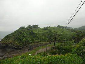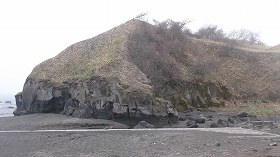 | 海に向かう途中の道から見たカムイミンタルチャシ。台地上は広大な地形となっている。 | アヨロ海岸から見たチャシの先端部分。 |