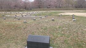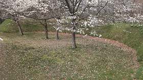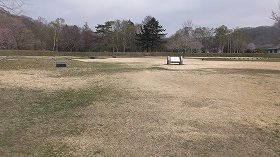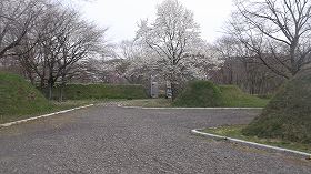 | 外曲輪には建造物の配置図が平面復元されている。 | 外曲輪内部。桜が咲いている。正面奥が内曲輪。 |