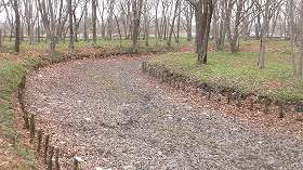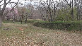 東側には土塁が廻らされているのだが、土塁の内側にも堀状の溝が掘られているのが特徴的である。古図を見てみると、稽古場の北側脇辺りにも虎口があったようであるが、見落としてしまったのか、確認できなかった。土塁の外側には水堀があり、そのさらに東側にはウトカンベツ川が流れるなど、東側の防御はかなり手厚いものとなっている。