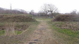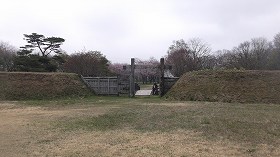 | 外曲輪南側の入口。円形の枡形状の空間となっている。右側に見えているのは、馬出し状蔀土塁の一部。 | 外曲輪入口。冠木門が復元されている。 |