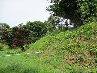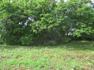 台地上に上がってみると、そこは一面の平坦地であった。中央南寄りの所に直径10mほどもある大きな窪みが見られた。これが遺構なのかどうか分からない。また、その周囲に低い土塁状の土盛もあったが、これまた後世の改変なのかよく分からない。