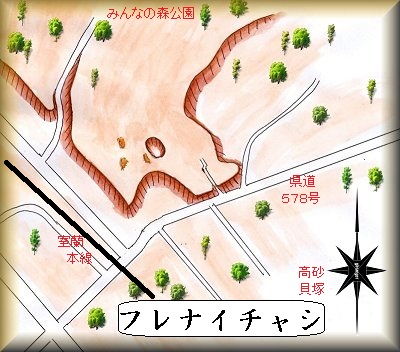 フレナイチャシは、県道578号線の北側、みんなの森公園の南側にある比高5mほどの微高地にある。