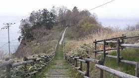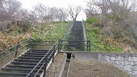 | 東側から見たカムイチャシ。砂浜なのに、チャシのある岬部分だけが海上に突き出している。周囲は絶壁である。 | トンネルの西側にある尾根上まで続く階段。高さはそれほどでもないのだが、けっこうきつい。登り口の脇には城址碑や案内板もある。 |