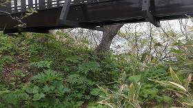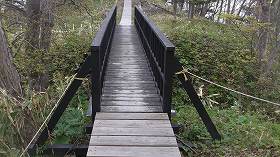 | 堀切上に架かる橋。 | 郭内部。傾斜地形となっており、たいしたスペースはない。 |