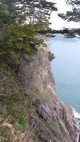 | 先端部分の岩盤を脇から覗き込んだ所。高いなあ! | 南西側先端近くには天然の竪堀のような地形がある。 |