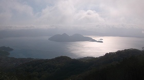 | この日宿泊したホテルから見た洞爺湖。絶景だなあ。 | 翌日は洞爺湖から山越えをして小樽に向かった。途中は雪が残っていて空気がきれいだった。途中の中山峠にはこんなに雪が残っていたが、この日は5月5日である! |