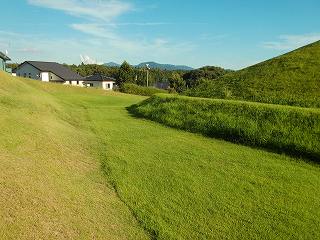前方の部分は、実際には上部が削られて広げられていた。郭スペースを生み出すために削ったものと推定される。その部分を盛り上げて、現在は古墳の復元が行われている。