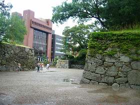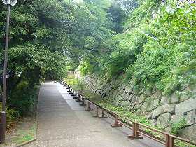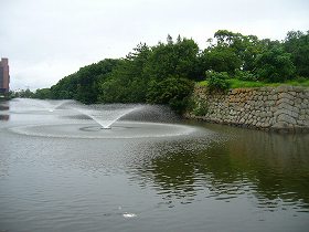 | 明石城の大手の外堀。かなり幅広であるが、平城のせいか、石垣はそれほど高く積まれてはいない。堀のすぐ脇には、JR明石駅がある。駅からとても近い城である。 | 城内は広いが駐車場がなかったので、東側の市営パーキングに車を留めて、東門から城内に入った。写真は東門の枡形である。 |
