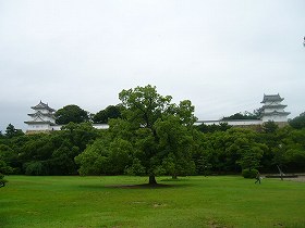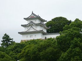 | 台地下からみた巽櫓と未申櫓。下の平城部分はかなり広く、この公園部分の他にも野球場や陸上競技場がある。 | 未申櫓。本丸にかつて4基あった櫓の中でも最大のものである。伏見城から移築されたものと伝えられている。阪神大震災ではこの櫓も被害を受け、下の石垣を積み直すために、レールに乗せられて、50mほど奥に移動させられたという。 |
