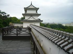 本丸の四隅にはそれぞれ三重櫓が建っていた。北側の2基はすでに失われてしまっているが、南側の巽櫓と未申櫓の2基は現存である。(以前訪れた時には、この2つの櫓を結ぶ白塀存在していなかったが、久しぶりに訪れてみると、2つの櫓は白塀で結ばれていた。こんなささやかなものでも、あると、かなり見た目がいい感じになるものである) 1994年の阪神淡路大震災では、この2基の櫓と、その下の石垣も被害を受けてしまった。そこで、櫓をレールによってそのまま奥に移動させ、石垣を積みなおすという作業が行われた。現在、この城の石垣を見ると積み方が新しく見える部分があるが、それはその際に積み直されたものである。