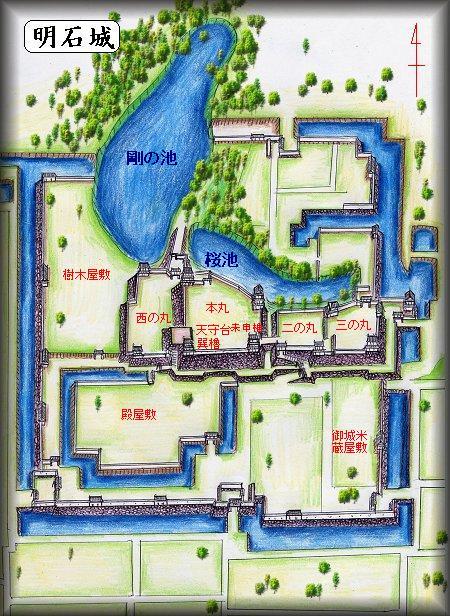 明石城はJRの明石駅のまん前にあり、駅からのアクセスがすこぶるよい。そのような立地であるという事もあって、この城が平城であると思われていることが多いが、実際に訪れてみると、本丸、二の丸、三の丸などがある部分は比高15mほどの台地の南端部になっている。したがって平山城といった方が当たっている。台地部分に平城部分をくっつけたような構造となっているのである。この台地の背後には大きな池があり、これを天然の堀として背後の防御に利用していた。また、南側の平地部分に堀はを掘り、平場の空間を大胆に城域内に取り込むことによって広大な城内空間を生み出していた。