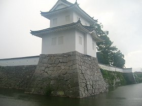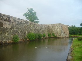 | 本丸の堀と石垣。こんな感じで、周囲をぐるりと取り巻いている。 | 本丸東北の櫓台。本丸はかなり複雑な折れを伴った多角形となっている。 |