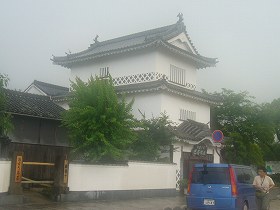 | 赤穂城の大手門の脇に立つ隅櫓。激しい雨のために、写真がすっかりかすんでしまっている。 | 大手門の目の前にはあやしい天守のようなものがあるが、これはおみやげ屋さんである。 |