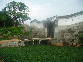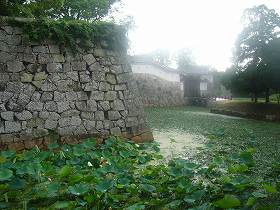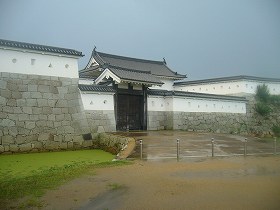| これは復元途中の二の丸堀。埋められていたものを掘り返しているのである。堀幅は最終的には20mほどになるのであろう。 | 近年復元された、本丸北側の門。 |