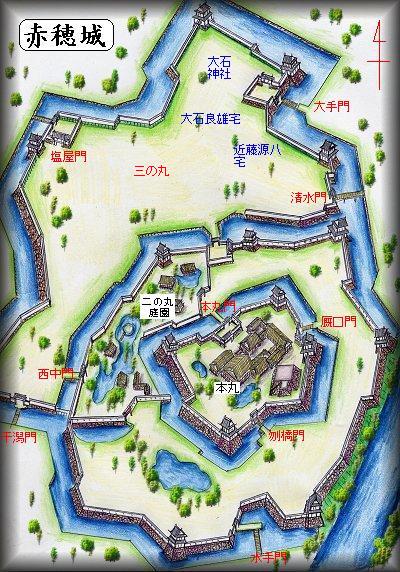 *現地案内板などを基にして鳥瞰図を作成してみた。赤穂城については正保城絵図が手元になかったので、図面だけを見て、櫓などはまったく想像で描いてみたものであるが、まあ、旧状もだいたいこんな感じではなかったかと思う。