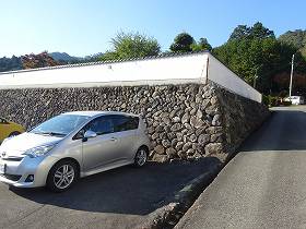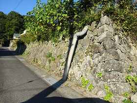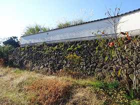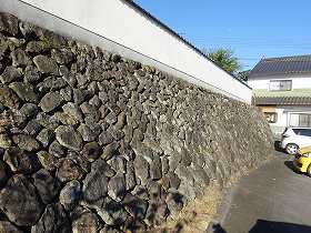 | 糸井陣屋の石垣と復元された白壁。すぐ真下が駐車場となっているため、停まっている車が写真に入ってしまう。 | 石垣に緩やかな折れがある。左側の先が現存する陣屋門。 |